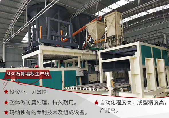 M30石膏墻板自動化生產(chǎn)線是鄭州瑪納引進國外最先進的石膏墻板生產(chǎn)工藝,經(jīng)過創(chuàng)新研發(fā)成功的針對石膏類隔墻板生產(chǎn)的裝備。生產(chǎn)的石膏隔墻板具有成型精度高、強度高、 質量優(yōu)、 耐水、 防火、 抗震、防潮、 產(chǎn)品綜合成本低等特性,很多性能標準優(yōu)于現(xiàn)行的標準,是完全符合墻改政策的新型裝備。
