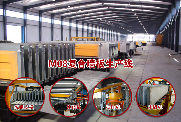 M08復合墻板生產(chǎn)線主要設(shè)備組成有:集約式低能耗養(yǎng)護室、第三代成組立模、立模回轉(zhuǎn)機、上抹面成型機、第三代液壓抽芯機、壓力注料系統(tǒng)、合板翻板機構(gòu)、推板機構(gòu),標準生產(chǎn)線產(chǎn)能年產(chǎn)達50萬㎡(2440mmX610mm)。