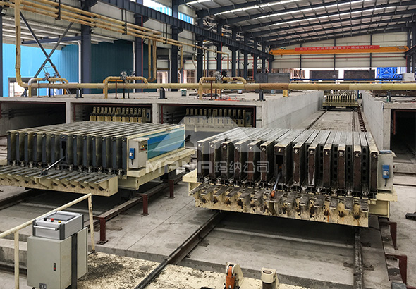 瑪納M07陶;炷翂Π迳a線是機械化模腔成型,成度精度高,生產線年產能為50萬平方米每年。生產線由成組立模、抽芯機、布料上面成型系統、出板清模系統、行走系統、蒸壓釜等功能主機組成。