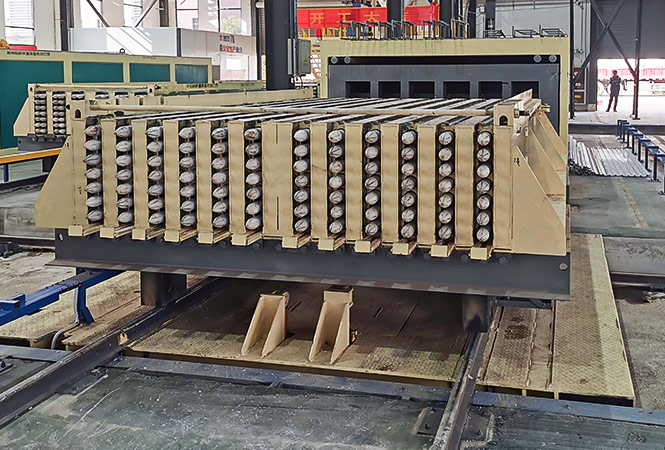 根據產能要求設計石膏墻板循環生產線,生產長度3000mm×寬度600mm×厚度100mm和長度3000mm×寬度600mm×厚度200m兩種規格產品,既滿足單獨生產,同時可混線生產,模車計劃100mm配置4套(12塊/模),200mm模車配置4套(6塊/模)。
