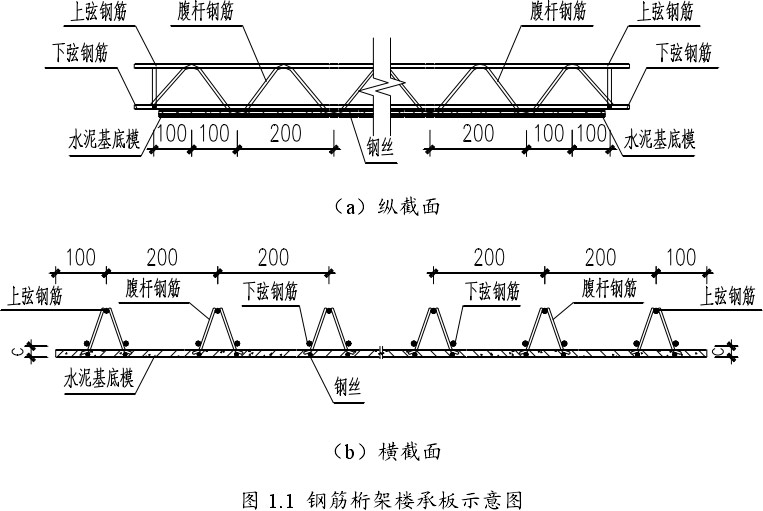 鋼筋桁架樓承板的縱截面示意圖和橫截面示意圖
