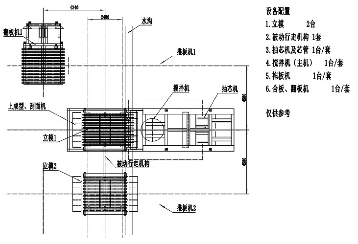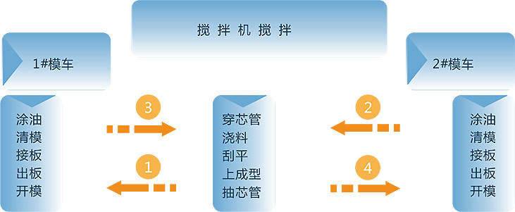 配置1號(hào)模車準(zhǔn)備穿芯管,布網(wǎng)、澆筑,刮平,上成型,抽芯管等待出板;