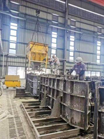 混凝土經(jīng)攪拌罐生產(chǎn)完畢后,經(jīng)由吊斗運輸?shù)綕仓䥇^(qū)澆筑。將混凝土澆筑到模具后,進(jìn)行振搗。