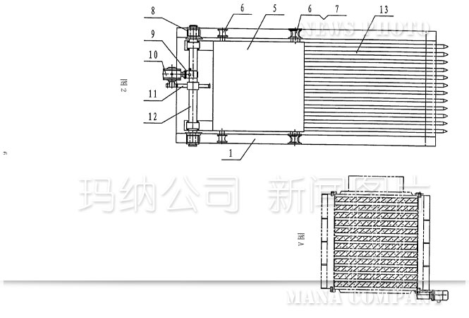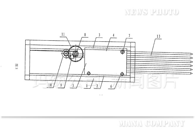 傳統(tǒng)的抽芯機(jī)結(jié)構(gòu)(如圖1——圖4):機(jī)架1上設(shè)置有下導(dǎo)軌2和上導(dǎo)軌3,在上導(dǎo)軌3的后半部分固定有齒條4,行走小車5上安裝的下滑輪6、上滑輪7、小齒輪8分別與下導(dǎo)軌2、上導(dǎo)軌3、齒條4接觸并能沿之前后移動,進(jìn)而帶動行走小車5前端連接的芯管13一起向前或向后移動,即完成多孔墻板在成型過程中穿、拔芯管的功能。上述運(yùn)動是由電機(jī)9、減速機(jī)10、大齒輪11、傳動軸12等組成的驅(qū)動系統(tǒng)帶動行走小車5上的小齒輪8與齒條4相嚙合來實(shí)現(xiàn)的。從上述結(jié)構(gòu)可以看到傳統(tǒng)的抽芯機(jī)動力傳動部分是機(jī)械傳動:電機(jī)9轉(zhuǎn)動——減速機(jī)10調(diào)速、換向——大齒輪11轉(zhuǎn)動——傳動軸12轉(zhuǎn)動——小齒輪8轉(zhuǎn)動與齒條4嚙合——行走小車5和芯管13前后平移,運(yùn)動轉(zhuǎn)換次數(shù)多、傳動結(jié)構(gòu)復(fù)雜、傳動零件種類多,從設(shè)計、制作、使用、檢修都比較麻煩,而且對芯管位移量的定位也不太精確。