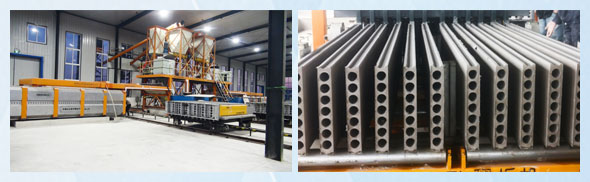 整個過程:配料→攪拌→壓力輸送→澆注入模→上面成型→養護→開模→出板機出板→循環。