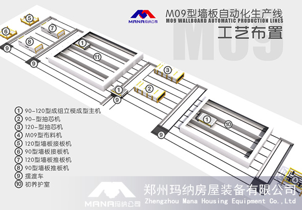 M09輕質墻板自動化生產線是鄭州瑪納公司自主創新研發的新型成組立模技術裝備,采用立模法機組流水工藝生產,使用瑪納多項MN設備、MN技術做支撐,擁有獨立的自主知識產權,主要主要滿足用戶大規劃、高品質、高度機械自動化的產品需要,是目前國內外最先進的成組立模法生產優質新型輕質隔墻板的成套生產設備。
